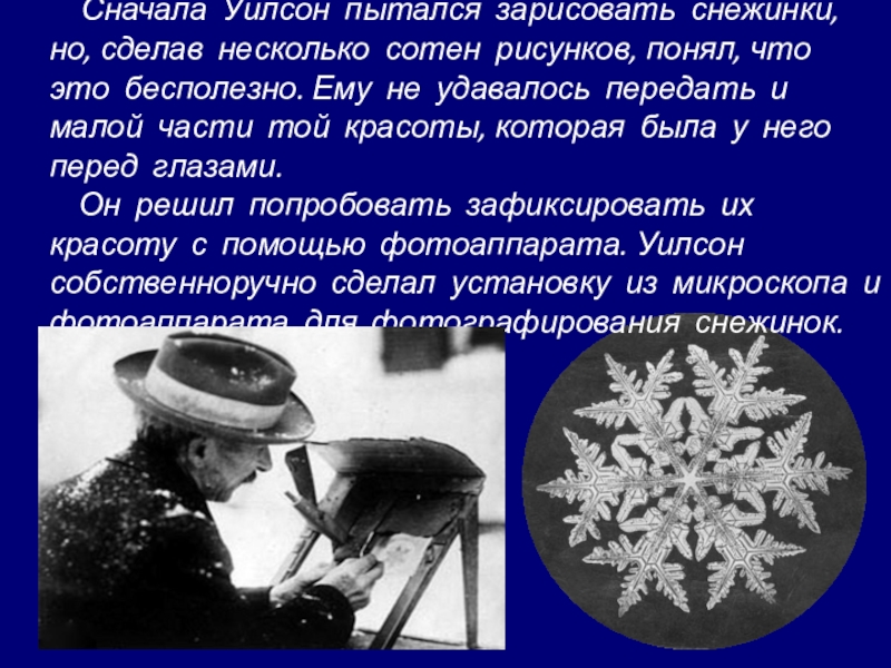 Слайд 11 Сначала Уилсон пытался зарисовать снежинки, но, сделав несколько сотен