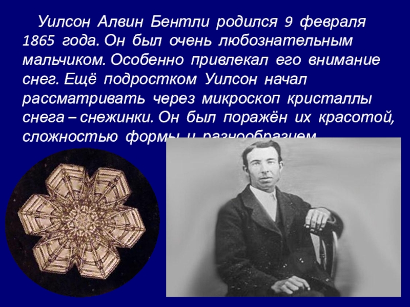 Слайд 10 Уилсон Алвин Бентли родился 9 февраля 1865 года. Он