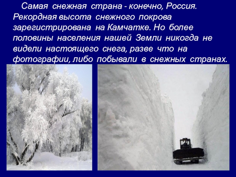 покрова зарегистрирована на Камчатке. Но более половины населения нашей Земли никогда не видели настоящего снега, разве что на фотографии, либо побывали в снежных странах.