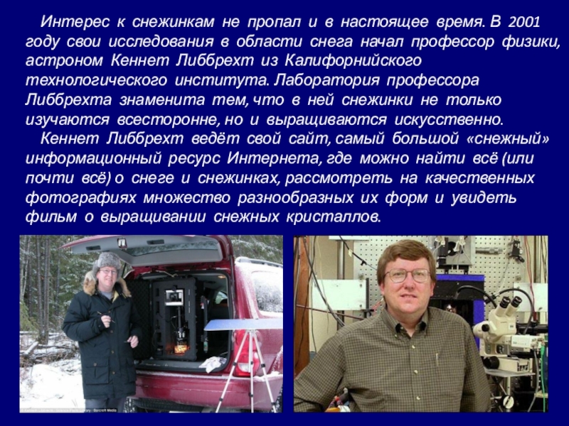 В 2001 году свои исследования в области снега начал профессор физики, астроном Кеннет Либбрехт из Калифорнийского технологического института. Лаборатория профессора Либбрехта знаменита тем, что в ней снежинки не только изучаются всесторонне, но и выращиваются искусственно.