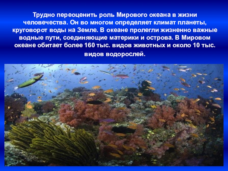 определяет климат планеты, круговорот воды на Земле. В океане пролегли жизненно важные водные пути, соединяющие материки и острова. В Мировом океане обитает более 160 тыс. видов животных и около 10 тыс. видов водорослей.