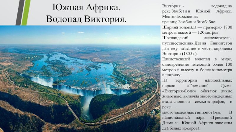 Викто́рия - водопад на реке Замбези в Южной Африке. Местонахождения: границе Замбии и Зимбабве.
