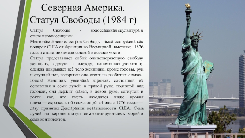 Статуя Свободы - колоссальная скульптура в стиле неоклассицизма.