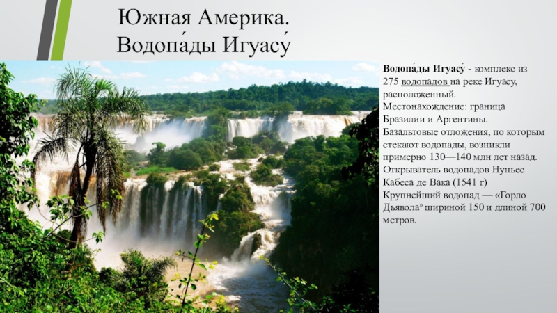 Водопа́ды Игуасу́ - комплекс из 275 водопадов на реке Игуасу,