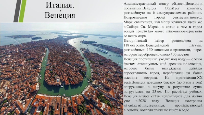 самоуправляемых районов. Покровителем города считается апостол Марк, евангелист, чьи мощи хранятся здесь же в Соборе Св. Марка, в связи с чем в город всегда приезжало много паломников-христиан со всего мира.