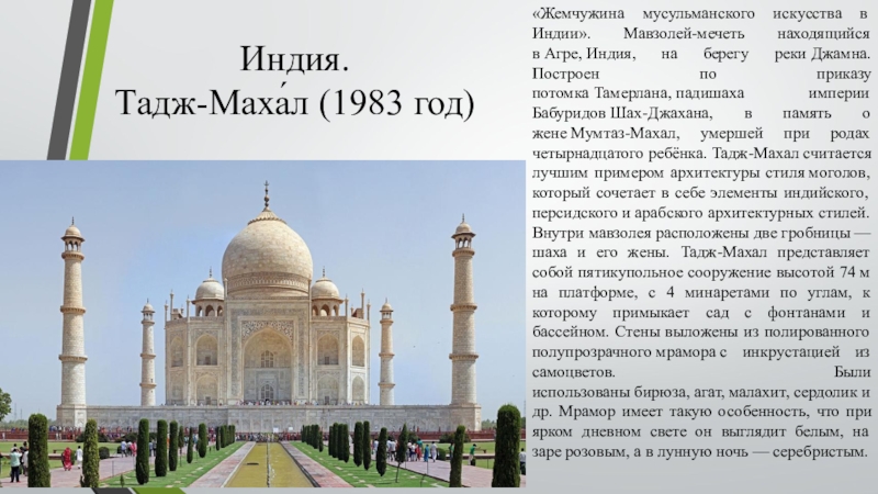 на берегу реки Джамна. Построен по приказу потомка Тамерлана, падишаха империи Бабуридов Шах-Джахана, в память о жене Мумтаз-Махал, умершей при родах четырнадцатого ребёнка. Тадж-Махал считается лучшим примером архитектуры стиля моголов, который сочетает в себе элементы индийского, персидского и арабского архитектурных стилей.