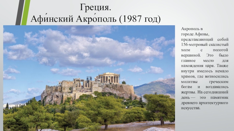 Акрополь в городе Афины, представляющий собой 156-метровый скалистый холм с