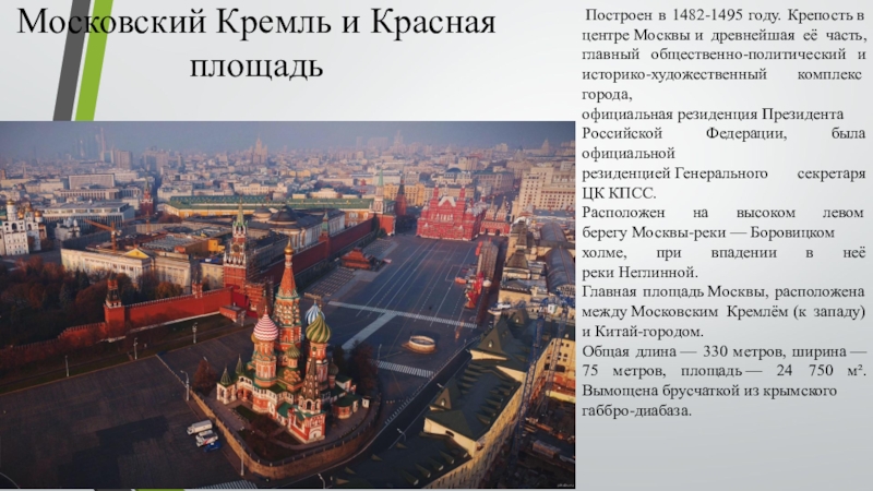 древнейшая её часть, главный общественно-политический и историко-художественный комплекс города, официальная резиденция Президента Российской Федерации, была официальной резиденцией Генерального секретаря ЦК КПСС.