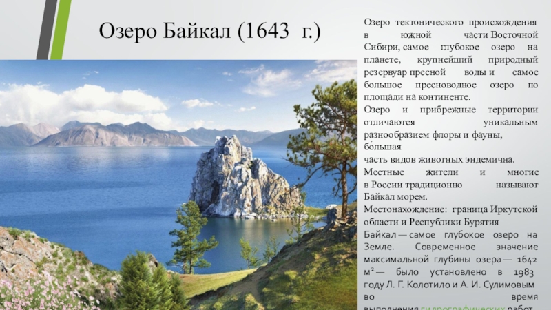 Байкал — самое глубокое озеро на Земле. Современное значение максимальной глубины озера — 1642 м2 — было установлено в 1983 году Л. Г. Колотило и А. И. Сулимовым во время выполнения гидрографических работ экспедицией ГУНиО МО СССР[8] в точке с координатами