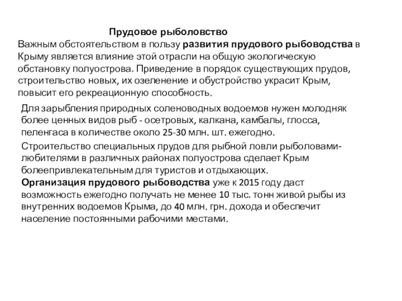 Организация прудового рыбоводства уже к 2015 году даст возможность ежегодно получать не менее 10 тыс. тонн живой рыбы из внутренних водоемов Крыма, до 40 млн. грн. дохода и обеспечит население постоянными рабочими местами.