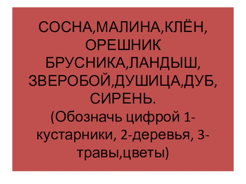 Слайд 23СОСНА,МАЛИНА,КЛЁН,ОРЕШНИК