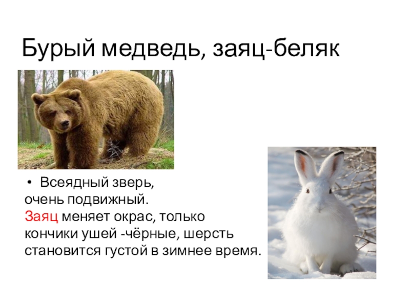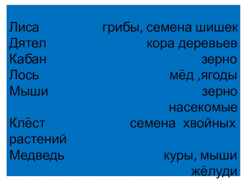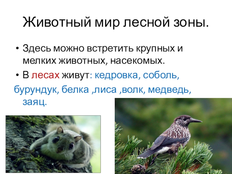 бурундук, белка ,лиса ,волк, медведь, заяц.