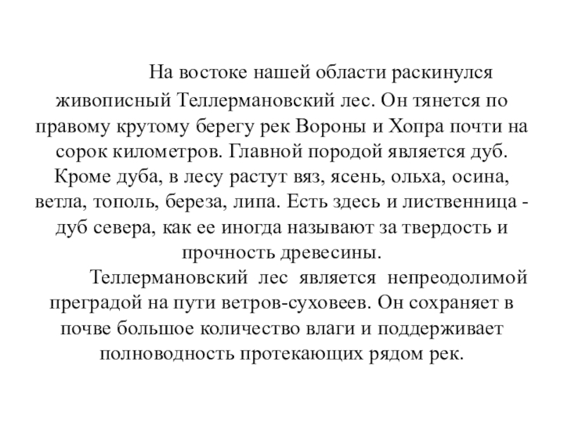 Слайд 18 На востоке нашей области раскинулся живописный Теллермановский лес. Он тянется