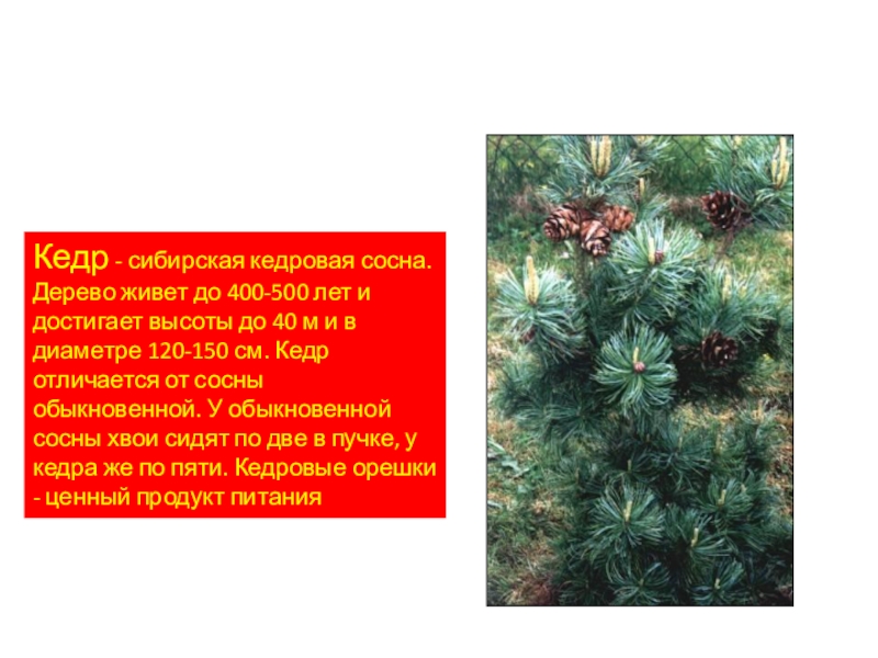 Слайд 11Кедр - сибирская кедровая сосна. Дерево живет до 400-500 лет и