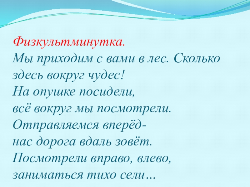 Слайд 9Физкультминутка. Мы приходим с вами в лес. Сколько здесь вокруг чудес! На опушке