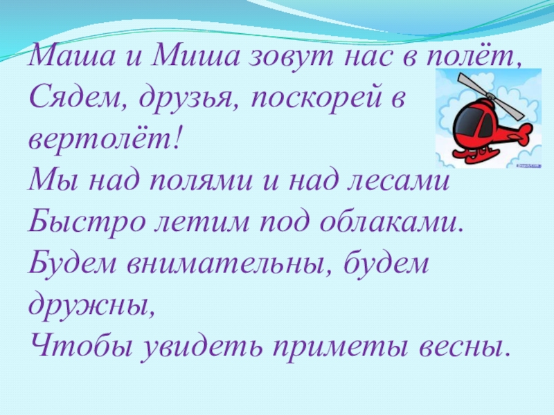 Слайд 6Маша и Миша зовут нас в полёт, Сядем, друзья, поскорей в вертолёт! Мы
