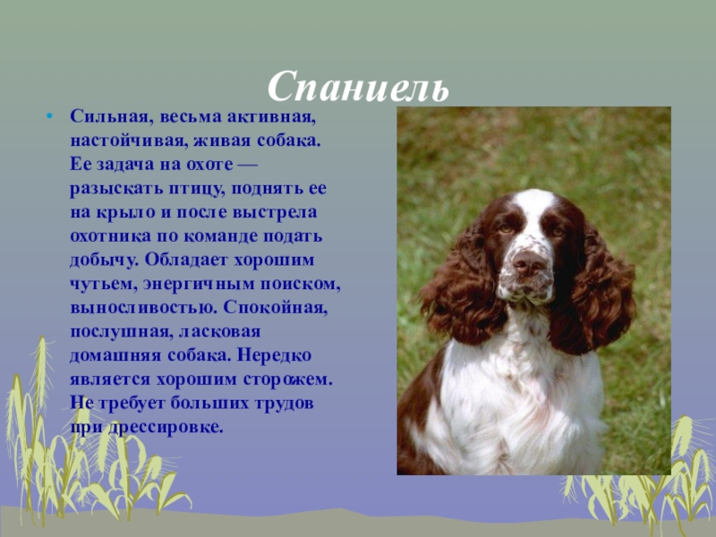 разыскать птицу, поднять ее на крыло и после выстрела охотника по команде подать добычу. Обладает хорошим чутьем, энергичным поиском, выносливостью. Спокойная, послушная, ласковая домашняя собака. Нередко является хорошим сторожем. Не требует больших трудов при дрессировке.
