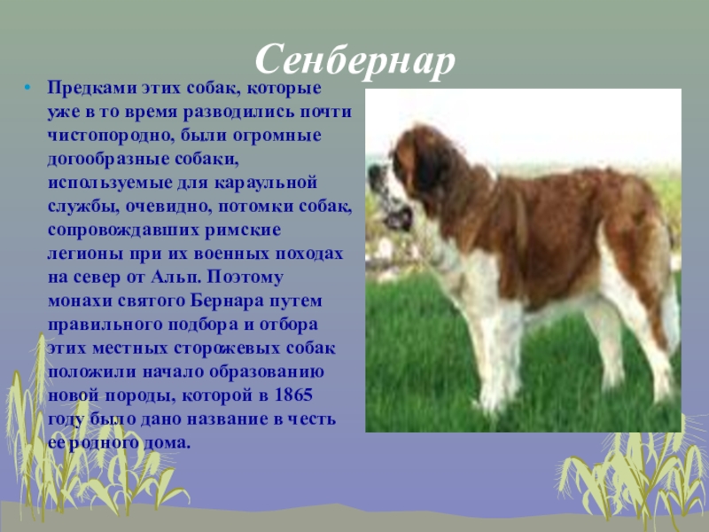 были огромные догообразные собаки, используемые для караульной службы, очевидно, потомки собак, сопровождавших римские легионы при их военных походах на север от Альп. Поэтому монахи святого Бернара путем правильного подбора и отбора этих местных сторожевых собак положили начало образованию новой породы, которой в 1865 году было дано название в честь ее родного дома.