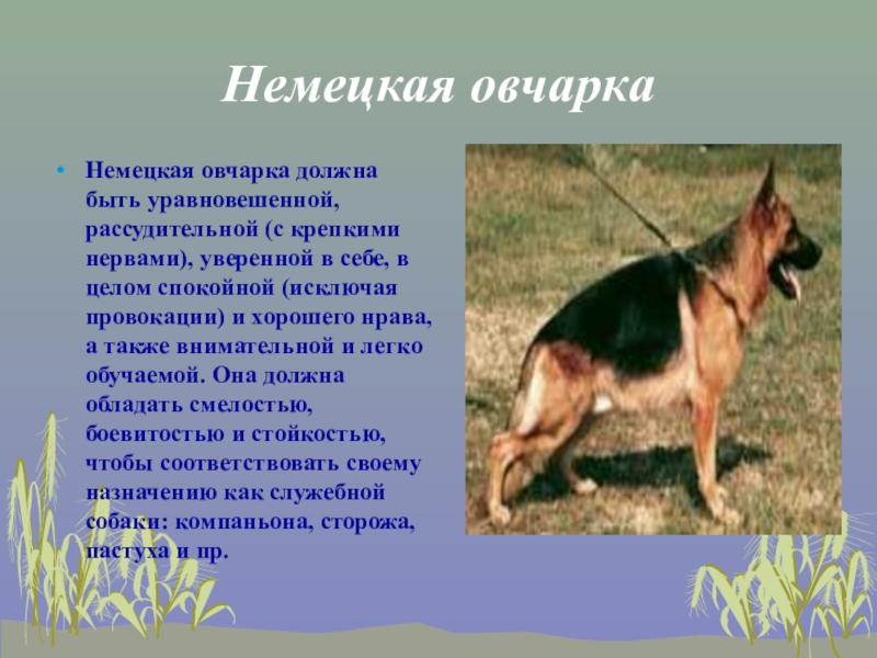 Немецкая овчарка должна быть уравновешенной, рассудительной (с крепкими нервами), уверенной