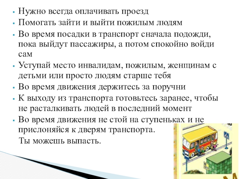 Во время движения не стой на ступеньках и не прислоняйся к дверям транспорта.