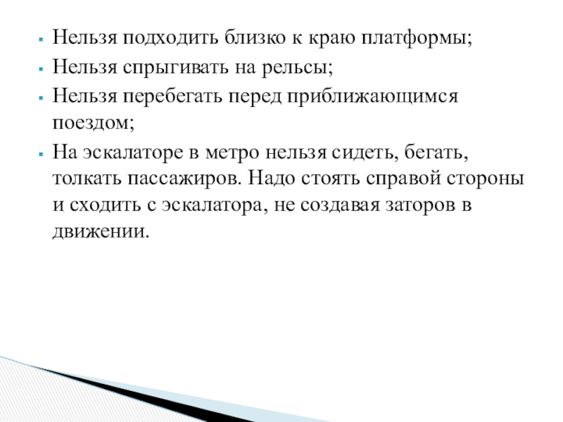 На эскалаторе в метро нельзя сидеть, бегать, толкать пассажиров. Надо стоять справой стороны и сходить с эскалатора, не создавая заторов в движении.