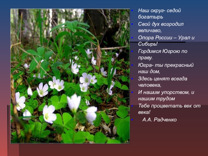 Флаг Ханты-Мансийского автономного округа был принят 14 сентября 1995 года. В левой верхней части флага расположен элемент белого цвета из герба Ханты-Мансийского автономного округа.