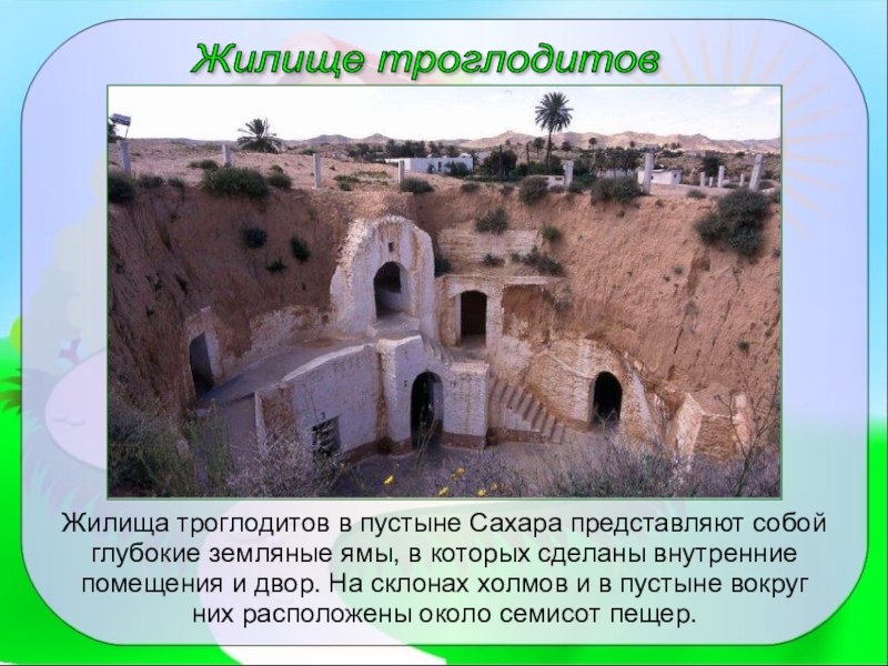 Жилища троглодитов в пустыне Сахара представляют собой глубокие земляные