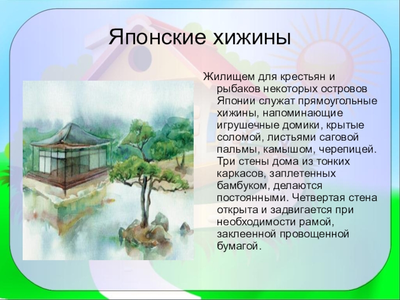 хижины, напоминающие игрушечные домики, крытые соломой, листьями саговой пальмы, камышом, черепицей. Три стены дома из тонких каркасов, заплетенных бамбуком, делаются постоянными. Четвертая стена открыта и задвигается при необходимости рамой, заклеенной провощенной бумагой.