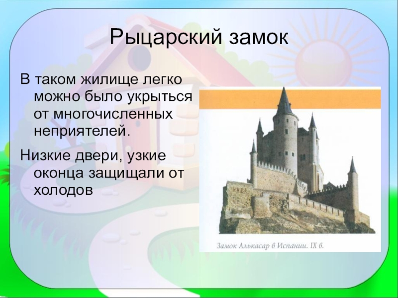каменное строение, обнесенное мощными стенами и окруженное глубоким рвом с водой. Часто замок находился в труднодоступном месте, на скале. К его единственным воротам вела узкая дорога, прекрасно просматриваемая со всех сторон.