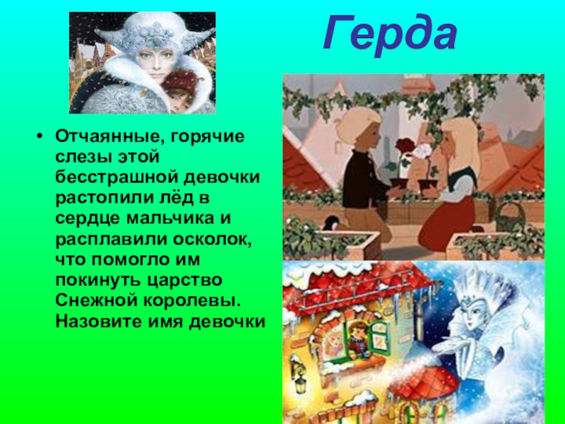 Отчаянные, горячие слезы этой бесстрашной девочки растопили лёд в сердце мальчика и расплавили осколок, что помогло им покинуть царство Снежной королевы. Назовите имя девочки