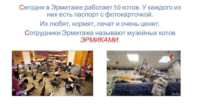 Слайд 4Сегодня в Эрмитаже работает 50 котов. У каждого из них есть