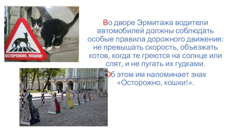 Во дворе Эрмитажа водители автомобилей должны соблюдать особые правила дорожного движения: не превышать скорость, объезжать котов, когда