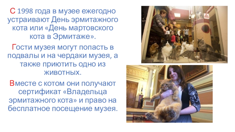 Слайд 5С 1998 года в музее ежегодно устраивают День эрмитажного кота или
