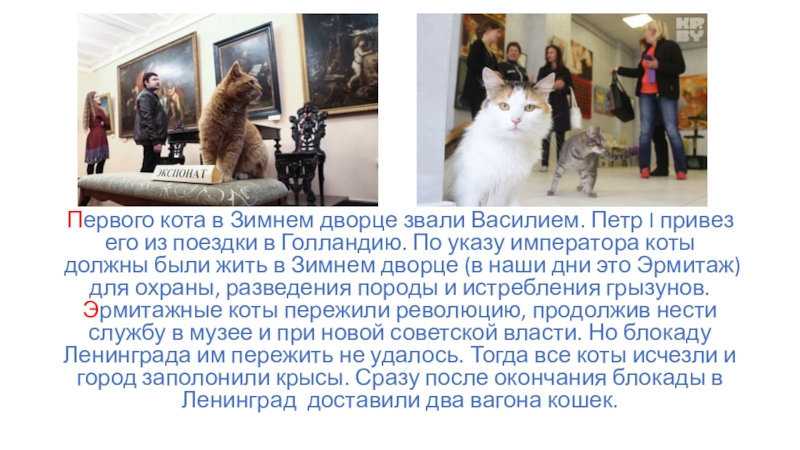 Слайд 3Первого кота в Зимнем дворце звали Василием. Петр I привез его