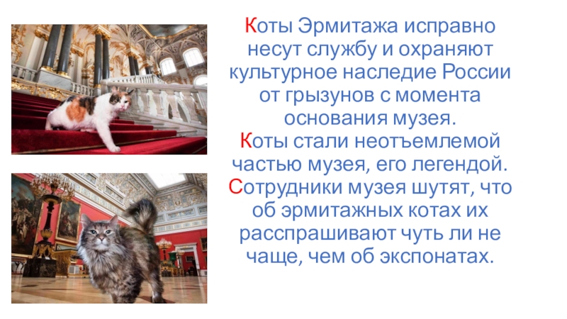 Слайд 2Коты Эрмитажа исправно несут службу и охраняют культурное наследие России от