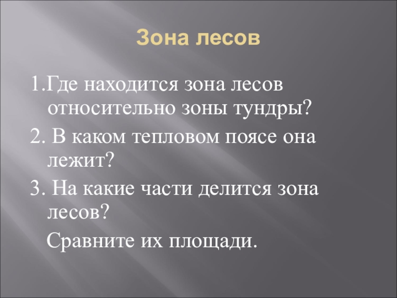 Зона лесов1.Где находится зона лесов относительно зоны тундры?2. В каком тепловом поясе она лежит?3. На какие части