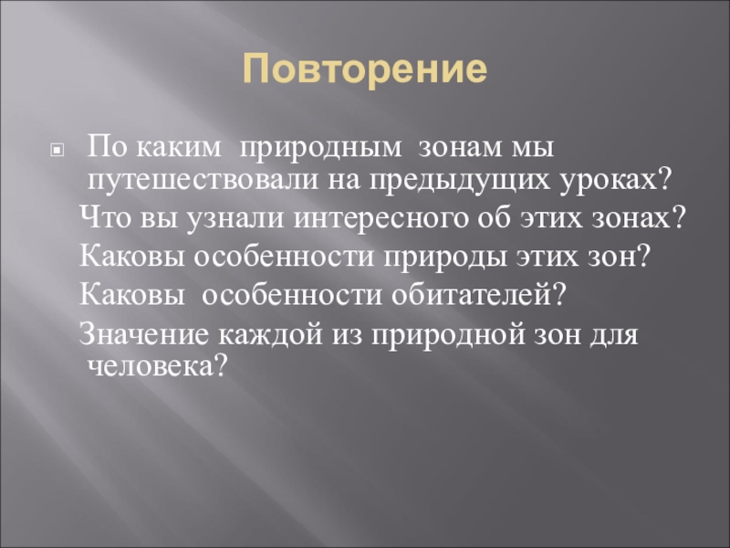 ПовторениеПо каким природным зонам мы путешествовали на предыдущих уроках?  Что вы узнали интересного об этих зонах?