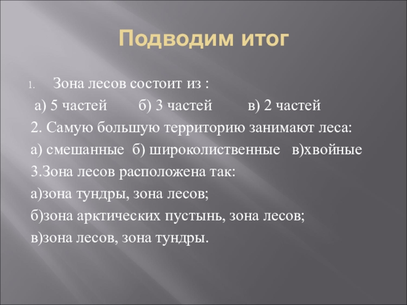 Подводим итогЗона лесов состоит из : а) 5 частей    б) 3 частей