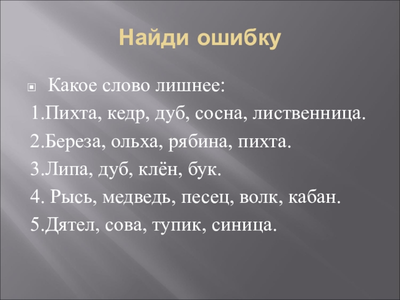 Найди ошибкуКакое слово лишнее:1.Пихта, кедр, дуб, сосна, лиственница.2.Береза, ольха, рябина, пихта.3.Липа, дуб, клён, бук.4. Рысь, медведь, песец,