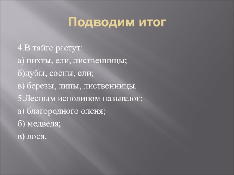 Подводим итог4.В тайге растут:а) пихты, ели, лиственницы;б)дубы, сосны, ели;в) березы, липы, лиственницы.5.Лесным исполином называют:а) благородного оленя;б) медведя;в)
