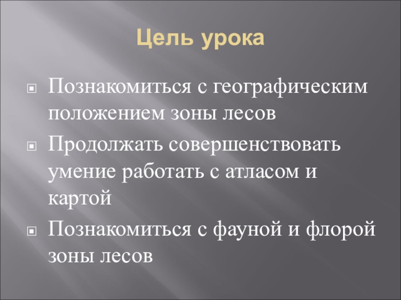 Цель урокаПознакомиться с географическим положением зоны лесовПродолжать совершенствовать умение работать с атласом и картойПознакомиться с фауной и флорой зоны лесов