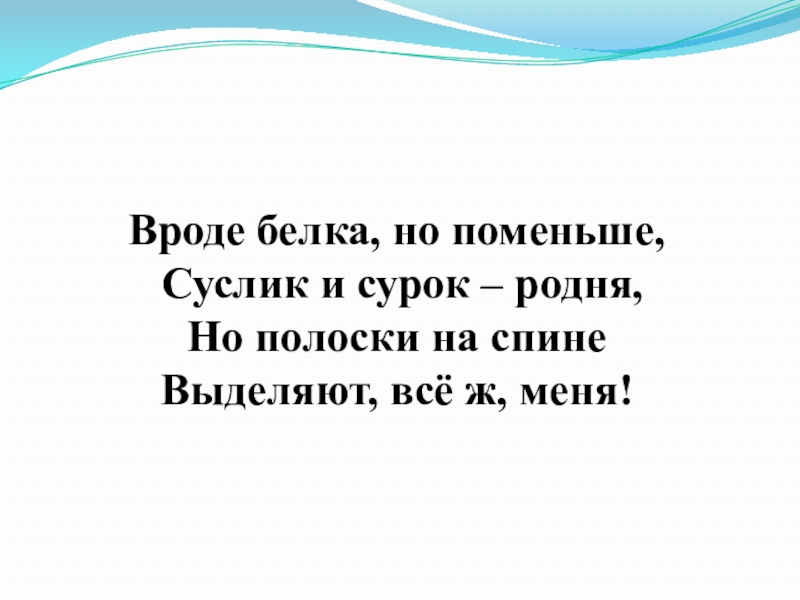 Вроде белка, но поменьше, Суслик и сурок – родня, Но полоски на спине Выделяют, всё ж, меня!