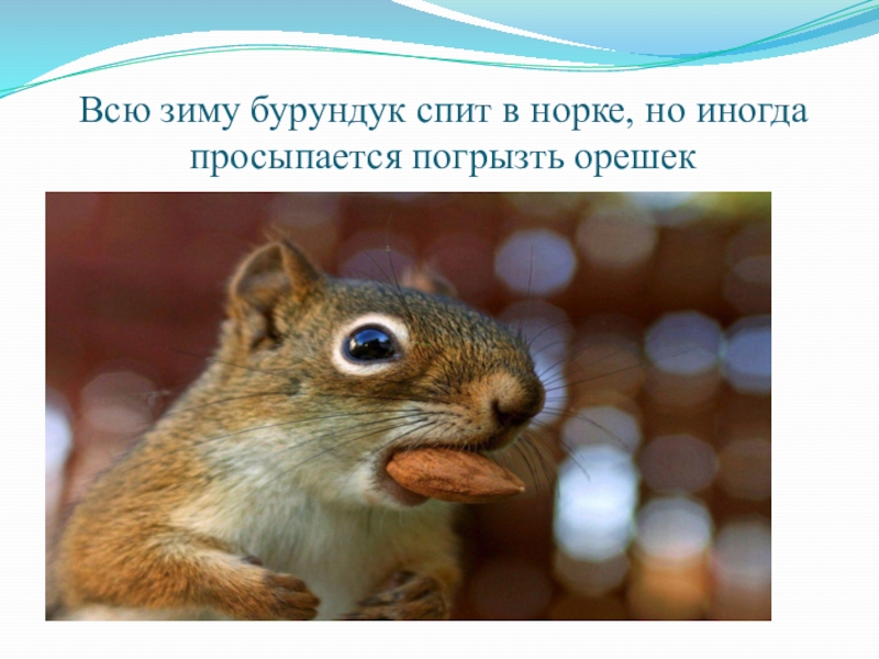 Слайд 8Всю зиму бурундук спит в норке, но иногда просыпается погрызть орешек