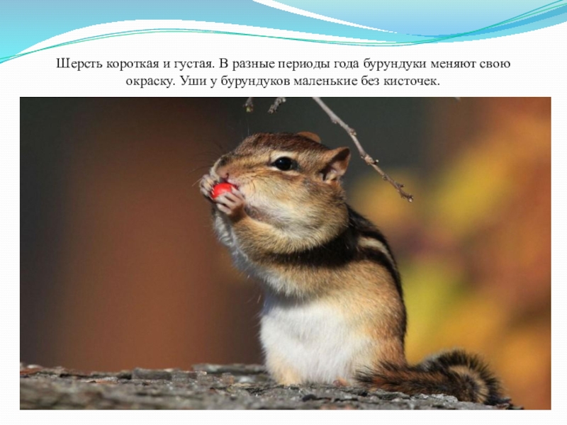 Слайд 6Шерсть короткая и густая. В разные периоды года бурундуки меняют свою