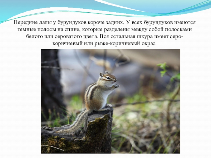 Слайд 5Передние лапы у бурундуков короче задних. У всех бурундуков имеются темные