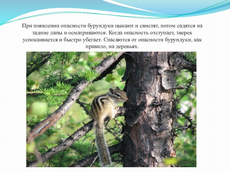 Слайд 11При появлении опасности бурундуки цыкают и свистят, потом садятся на задние