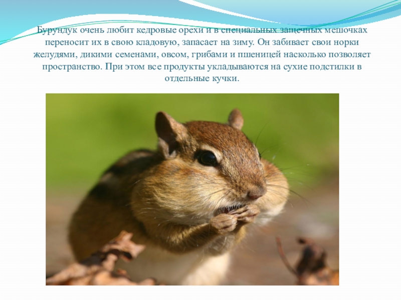Слайд 7Бурундук очень любит кедровые орехи и в специальных защечных мешочках переносит
