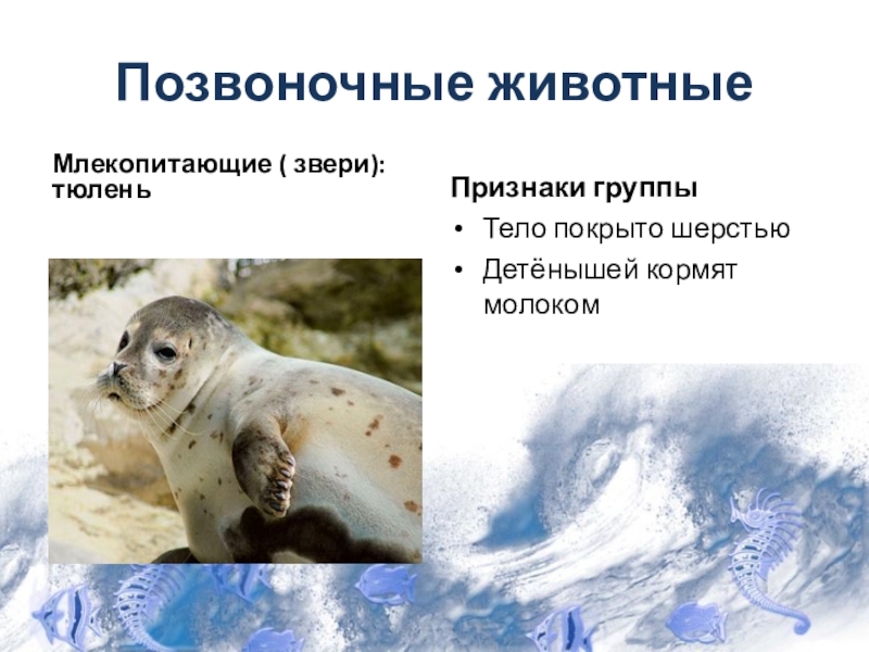 Позвоночные животныеМлекопитающие ( звери): тюленьПризнаки группыТело покрыто шерстьюДетёнышей кормят молоком