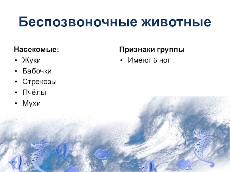 Беспозвоночные животныеНасекомые:ЖукиБабочкиСтрекозыПчёлыМухи Признаки группыИмеют 6 ног