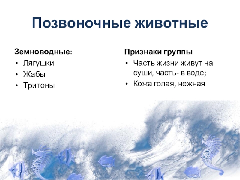 Позвоночные животныеЗемноводные:ЛягушкиЖабыТритоны Признаки группыЧасть жизни живут на суши, часть- в воде;Кожа голая, нежная